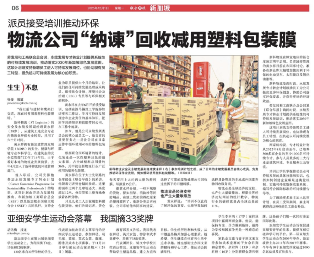 In a feature by Lianhe Zaobao, Francis Ng, Deputy Manager for Safety and Sustainability at ST Logistics, shared how the company is recovering and reducing plastic film waste while strengthening green capabilities within its workforce.