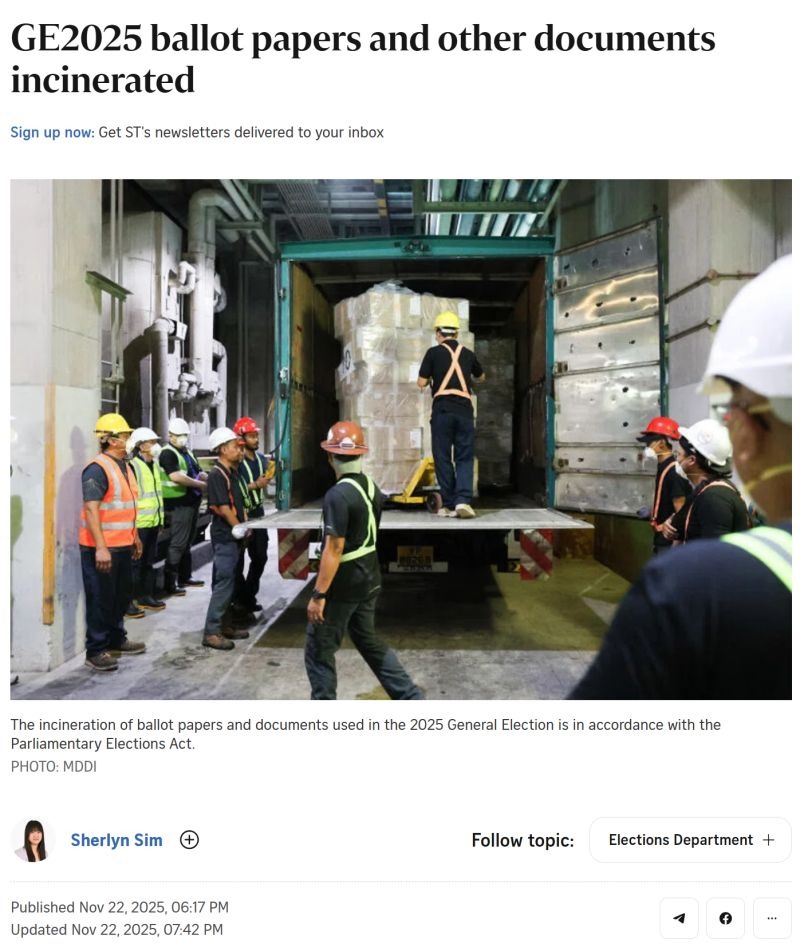 The Straits Times featured a video capturing the final stage of Singapore’s GE2025 process — the secure destruction of ballot papers and election documents, conducted under strict procedures to safeguard the secrecy of the vote.